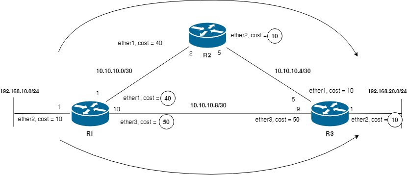 Router lain akan menggunakan parameter cost yang dikonfigurasikan pada interfacenya sendiri. Apa yang akan terjadi jika dua router yang terhubung secara langsung mengkonfigurasikan cost yang berbeda pada setiap interfacenya? Seperti yang terlihat pada gambar berikut, dimana interface ether1 milik Router R1 memiliki parameter cost yang berbeda dengan interface ether3 milik Router R3.