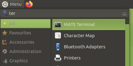 Sebelum mulai menginstal Thingsboard, alangkah baiknya kita menginstall SSH server terlebih dahulu, sehingga kita bisa me-remote Ubuntu Mate saat proses instalasi Thingsboard, meskipun kita jua bisa menginstalnya secara langsung melalui “MATE Terminal”. Untuk menginstall SSH server, silahkan ikut langkah berikut ini: Buka aplikasi MATE Terminal melalui “Menu”, kemudian tuliskan “terminal” pada kolom pencarian, kemudian klik menu “MATE Terminal” atau cara mudahnya menggunakan keyboard shortcut Ctrl+Alt+T.
